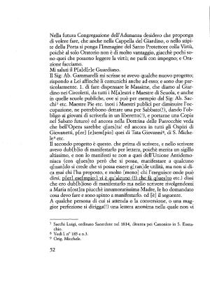 Il Sig : Ab . Gammarelli mi scrisse se avevo qualche nuovo progetto ; rispondo a Lei affinchè li comunichi anche ad esso ; e sono due particolarmente . 1 . di fare dispensare le Massime , che diamo al Giardino nei Circoletti , da tutti i M [ a ] estri e Maestre di Scuola , e anche in quelle scuole publiche , ove si può per esempio dal Sig : Ab . Sacelli7 etc . Maestre Pie etc . ( noti i Maestri publici per diminuire l ’ occupazione , ne potrebbono dettare una per Sabbato (!), dando l ’ obbligo ai giovani di scriverla in un liberetto ( l ), e portarne una Copia nel Sabato futuro ) ed ancora nella Dottrina delle Parrocchie veda che bell ’ Opera sarebbe q [ ues ] ta ! ed ancora in tutti gli Ospizi di