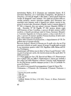 Giovanni Batti [ sta ], di S . Gio [ vanni ] Evangelista , del glorioso S . Vincenzo , e di tutti gli Angeli , e altri Santi , e anime giuste beate ho l ’ ardire di diriggerle i miei caratteri . Per carità mi perdoni della soverchia tardanza , mentre attendeva qualche altra Divozione per mandarle tutto insieme ; onde si degnerà per adesso , mentre in appresso le invierò altre divozioni e Pagelle , onde si compia almeno il N ° 500 , si degnerà , dico per adesso , ricevere : Massime ( IDDio ci vede - Eternità ). N ° 90 : Pagelle . N ° 200 . incirca : alcune copie dell ’ Orazione al Smo Crocifìsso , e procuri di farle mettere nel [ le ] tavolette , o Quadri piccioli per tutte le Chiese , Seminari , Monasteri , Conventi , Sagrestie etc : le faccia copiare , e dica a tutti che le copino , e procuri di esortare qualche Persona facoltosa di farle stampare , onde sempre più propagarle :, 1