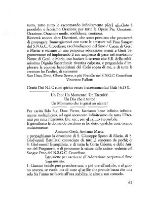 Riceverà ancora altre Divozioni , che sono persuaso che procurerà di propagare . Immergiamoci con tutte le creature nel Pmo Sangue del S . N . G . C . Crocefisso ; racchiudiamoci nel Smo / Cuore di Gesù e Maria : e viviamo in una perpetua adorazione avanti a Gesù Sagramentato : ed implorando il suo amplesso di pace nel soavissimo