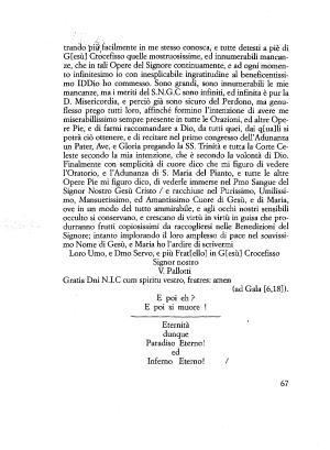 trancio pitffacilmente in me stesso conosca , e tutte detesti a piè di G [ esù ] Grocefisso quelle mostruosissime , ed innumerabili mancanze , che in tali Opere del Signore continuamente , e ad ogni momento infinitesimo io con inesplicabile ingratitudine al beneficentissimo IDDio ho commesso . Sono grandi , sono innumerabili le mie mancanze , ma i meriti del S . N . G . C sono infiniti , ed infinita è pur la D . Misericordia , e perciò già sono sicuro del Perdono , ma genuflesso prego tutti loro , affinché formino l ’ intenzione di avere me miserabillissimo sempre presente in tutte le Orazioni , ed altre Opere Pie , e di farmi raccomandare a Dio , da tutti quei , dai q [ ua ] li si potrà ciò ottenere , e di recitare nel primo congresso dell ’ Adunanza un Pater , Ave , e Gloria pregando la SS . Trinità e tutta la Corte Celeste secondo la mia intenzione , che è secondo la volontà di Dio .