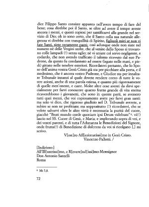 numero nè delle Vergini stolte , che al venire dello Sposo si trovarono colle lampadi (!) senza oglio ; nè vi uniate col servo negligente , e codardo , che non avendo trafficato il talento ricevuto dal suo Padrone , da questo fu condannato ad essere ( legato nelle mani , e piedi ) gittate nelle tenebre esteriori . Ricordatevi pertanto , che lo Sposo dell ’ anima vostra Gesù Cristo già sta per picchiare alla porta , e il medesimo , che è ancora vostro Padrone , e Giudice sta per innalzare Tribunale innanzi al quale dovete rendere conto di tutte le vostre azioni , anche di una parola oziosa , e quanto più rigorosamente di quelle men ’ oneste , e caste . Molte altre cose averei da dirvi specialmente per farvi conoscere quanto frutto grande di vita eterna ricaverebbono i giovanetti , che sono in queste parti , se avessero tutti quei mezzi , che voi copiosamente avete per farvi gran santi : ma solo vi dico , che rigoroso giudizio nel D . Tribunale averete , a subire se non ne profittate ; ma sopprattutto (!) ricordatevi , che se volete salvarvi oltre le altre virtù è necessaria la purità del cuore , giacché “ Beati mundo corde quoniam ipsi Deum videbunt ” 6 . vi (!) lascio nel SS . Cuore di Gesù , e Maria ; e implorando sopra di voi , e dei vostri parenti , e di tutta l ’ Adunanza le Benedizioni del Signore , onde frutta (!) di Benedizione di dolcezza da voi si ricolgano [,] mi scrivo .