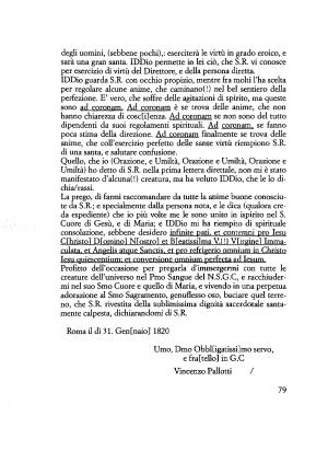 Profitto dell ’ occasione per pregarla d ’ immergermi con tutte le creature dell ’ universo nel Pmo Sangue del N . S . G . C , e racchiudermi nel suo Smo Cuore e quello di Maria , e vivendo in una perpetua adorazione al Smo Sagramento , genuflesso oso , baciare quel terreno , che S . R . rivestita della sublimissima dignità sacerdotale santamente calpesta , dichiarandomi di S . R .
