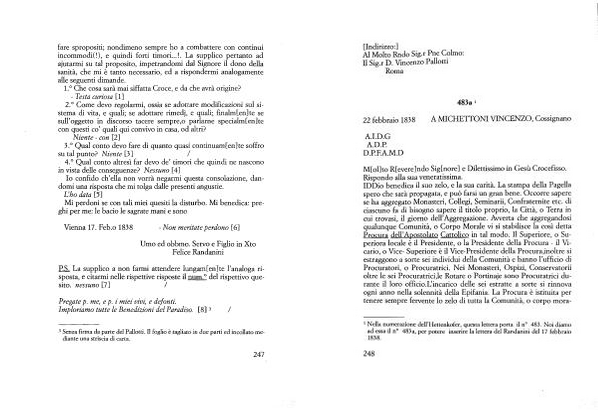 fare spropositi ; nondimeno sempre ho a combattere con continui incommodi (!), e quindi forti timori ...!. La supplico pertanto ad aiutarmi su tal proposito , impetrandomi dal Signore il dono della sanità , che mi è tanto necessario , ed a rispondermi analogamente alle seguenti dimande . 1 . ° Che cosa sarà mai siffatta Croce , e da che avrà origine ?