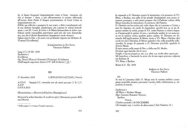 Messe benedica le intenzioni e le premure del Pastore . D . Dionisio mi ha scritto più volte dopo che si è portato a Cività ; e non ho risposto , nè credo di rispondere , perchè non so se sia disposto sentire la verità , prego la V . S . come Pastore a volersi degnare d ’ insinuargli lo spirito di vera , e profonda umiltà , la cui mancanza mi fa temere vicina qualche grave caduta . D . Dionisio mi domanda dell ’ applicazione di Messe , invio a V . S . Illma e Rndma altri scudi tre p [ er ] limosina di Messe quindeci che colla possibile sollecitudine la prego di passarla a D . Dionisio p [ er ] chè applichi le d [ ett ] e Messe .
