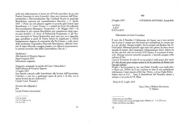 Benedizione - C . Card . Vicario = 3 e quindi da S [ ua ] E [ ccellenza ] R [ everendissi ] ma Monsignor Vicegerente - 29 . Maggio 1835 = Si concedono le più copiose Benedizioni pel compimento degli esposti santi desiderj = A . Arciv . di Trebisonda Vicegerente = 4 , gli Oratori venerando in Vostra Beatitudine quel tutto per cui è unus Pastor , genuflessi ai piedi di Vostra Santità la supplicano a volersi benignamente degnare di compartire alla Pia Unione , e sulle opere della medesima l ’ Apostolica Pastorale Benedizione , affinché riempiti di sagro fiduciale coraggio possino con efficacia perpetuamente operare secondo i fini della Carità infinita . Che etc . /