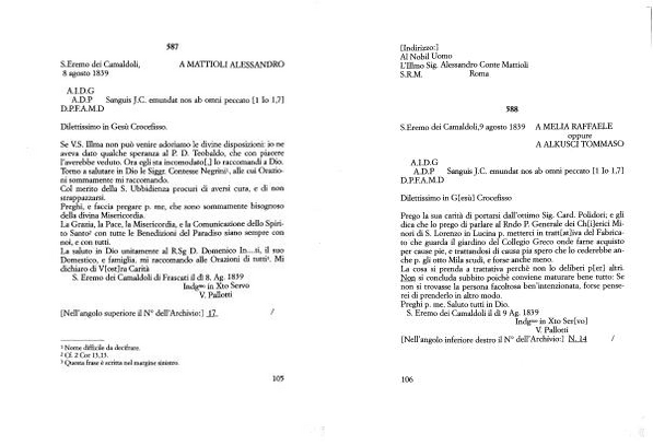 La Grazia , la Pace , la Misericordia , e la Comunicazione dello Spirito Santo12 con tutte le Benedizioni del Paradiso siano sempre con noi , e con tutti . La saluto in Dio unitamente al R . Sg D . Domenico In .... ti , il suo Domestico , e famiglia , mi raccomando alle Orazioni di tutti3 . Mi dichiaro di V [ ost ] ra Carità S . Eremo dei Camaldoli di Frascati il dì 8 . Ag . 1839