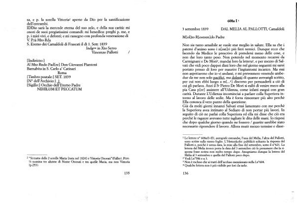 1 Le lettere n ° 608a ( I + II ), autografe entrambe , l ’ una del Melia , l ’ altra del Pallotti , sono scritte sullo stesso foglio . L ’ Hettenkofer pubblicò soltanto la risposta del