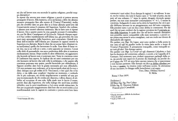 conoscere i suoi voleri . Ecco dunque le ragioni 1 . ne soffrono le mani , ma ho veduto che tutte le hanno sane : 2 ° fa male al petto , ma mi pare ad una soltanto : 3 .° tiene lo spirito divagato dovendo spesso parlare , ma non sono monache6 contemplative : 4 .° vi [„. 7 ] mezzo la coscienza . Indagando il come mi ha detto la Superiora che ciò è perchè debbono lavorare in un atteggiamento non del tutto composto .
