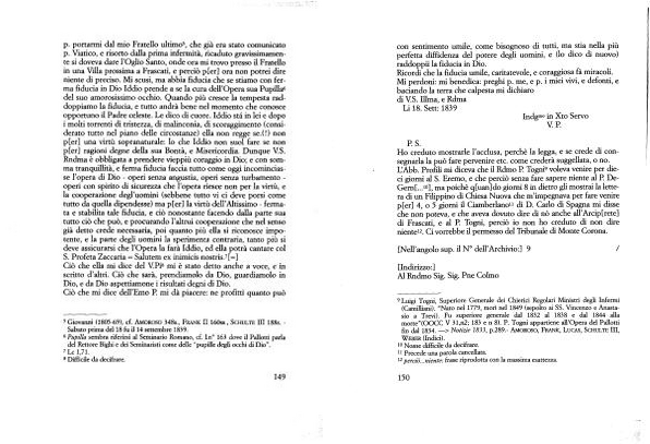 p . portarmi dal mio Fratello ultimo5 , che già era stato comunicato p . Viatico , e risorto dalla prima infermità , ricaduto gravissimamente si doveva dare l ’ Oglio Santo , onde ora mi trovo presso il Fratello in una Villa prossima a Frascati , e perciò p [ er ] ora non potrei dire niente di preciso . Mi scusi , ma abbia fiducia che se stiamo con ferma fiducia in Dio Iddio prende a se la cura dell ’ opera sua Pupilla6 del suo amorosissimo occhio . Quando più cresce la tempesta raddoppiamo la fiducia , e tutto andrà bene nel momento che conosce opportuno il Padre celeste . Le dico di cuore . Iddio sta in lei e dopo i molti torrenti di tristezza , di malinconia , di scoraggimento ( considerato tutto nel piano delle circostanze ) ella non regge se .(!) non p [ er ] una virtù sopranaturale : lo che Iddio non suol fare se non p [ er ] ragioni degne della sua Bontà , e Misericordia . Dunque V . S .