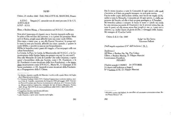 Mi benedica adesso e sempre : le bacio le mani e i piedi : mi creda ho una estrema necessità di Orazioni [;] me le procuri senza fine da tutte le parti ; ed ella stessa senza fine preghi p . me , p . i miei vivi e defonti , e p . molte Opere di gloria di Dio , e vantaggio delle Anime .