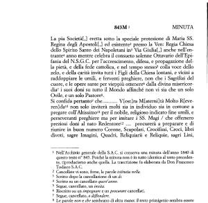 1 Nell ’ Archivio generale della S . A . C . si conserva una minuta dell ’ anno 1840 di questo testo n ° 843 . Poiché la minuta non è in tutto identica al testo precedente , riproduciamo anche quella . La trascrizione fu elaborata da Don Francesco
