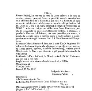 Eterno Padre [,] in unione di tutta la Corte celeste , e di tutte le creature passate , presenti , future , e possibili intendo avervi offerto , e offerirvi da tutta la Eternità , e per tutta / la Eternità ad ogni momento infinitesimo infinite volte , e intendo colla perfezione dei SS . Cuori di Gesù , e di Maria offerirvi il Sangue preziosissimo di N . S . G . C . in isconto dei peccati della vostra Serva Francesca , perchè le concediate un cuore perfettamente contrito , e umiliato4 , e perchè la liberiate dall ’ inferno , ove non potrebbe più amarvi , e perchè la facciate santa , e perfetta come il Padre celeste , e in ringraziamento come già le aveste dato il S . Paradiso senza il Purgatorio .