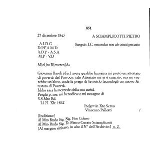 Giovanni Baroli p [ er ] avere qualche limosina mi portò un attestato di povertà del Parroco : tale Attestato mi si è smarito , ora ne vorrebbe un ’ altro , onde la prego di favorirlo facendogli un nuovo Attestato di Povertà .