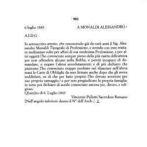 Io sottoscritto attesto , che conoscendo già da varii anni il Sig . Alessandro Monaldi Tipografo di Professione , e avendo con esso trattato moltissime volte per affari di sua medesima Professione , e per altri oggetti l ’ ho conosciuto sempre pieno della più esatta delicatezza per non offendere alcuno nella Robba , e perciò incapace di domandare , o negare l ’ altrui avvedutamente ; e di più dichiaro che piuttosto l ’ ho conosciuto troppo modesto nel rilasciare nell ’ altrui mani le Carte di Obblighi da esso firmate anche dopo che gli aveva soddisfatti , su di che per fatto proprio l ’ ho dovuto avvertire per suo proprio vantaggio , 12 e per non pregiudicare la propria famiglia ; in tutto poi dichiaro di averlo conosciuto ancora pio , divoto , e religioso . Q [ ues ] to dì 6 . Luglio 1843