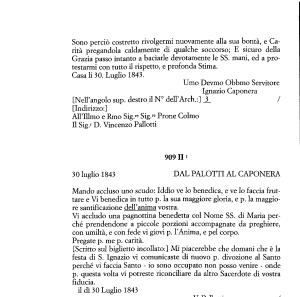 Pregate p . me p . carità . [ Scritto sul biglietto incollato :] Mi piacerebbe che domani che è la festa di S . Ignazio vi comunicaste di nuovo p . divozione al Santo perché vi faccia Santo - io sono occupato non posso venire - onde p . questa volta vi potreste riconciliare da altro Sacerdote di vostra fiducia . il dì 30 Luglio 1843 V . Pallotti /