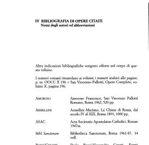 I numeri romani rimandano ai volumi , i numeri arabici alle pagine , p . es . OOCC X 196 = San Vincenzo Pallotti , Opere Complete , volume X , pagina 196 .