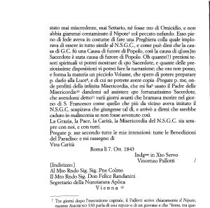 Sacerdote è stata causa di furore di Popolo . Oh quante (!) preziosi tesori spirituali vi potrei mostrare di qto Sacerdote , e quante delle preziosissime disposizioni vi potrei fare la narrazione ; che ora non posso , e forma la materia un picciolo Volume , che spero di potere preparare p . darlo alla Luce8 , e di cui ne potrete avere copia -Pregate p . me , onde profitti della infinita Misericordia , che mi ha9 usato il Padre delle