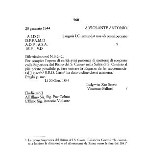 Per compire l ’ opera di carità avrà pazienza di mettersi di concerto colla Superiora del Ritiro del S . Cuore1 nella Salita di S . Onofrio al più presto possibile p . fare entrare la Ragazza da lei raccomandata [,] giacché S . E . D . Carlo12 ha dato ordine che si ammetta .