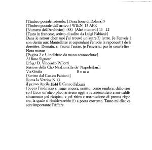 [ Timbro postale rotondo : [ Direzione di Ro [ ma ] 5 [ Timbro postale dell ’ arrivo :] WIEN 13 APR [ Numero dell ’ Archivio :] ( 88 ) [ Altri numeri :] 13 12 [ Testo in francese , scritto di solito da Luigi Fabiani :]