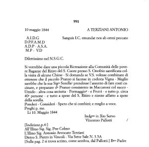 Si vorrebbe dare una piccola Ricreazione alla Comunità delle povere Ragazze del Ritiro del S . Cuore presso S . Onofrio santificata colla visita di alcune Chiese - Si domanda se V . S . volesse combinare di ottenere che il piccolo Pranzo si facesse in codesta Vigna - Meglio sarebbe che la sua Sigra Sorella1 prendesse l ’ assunto di fare costì cucinare , e preparare d ° Pranzo consistente in Maccaroni col succo -