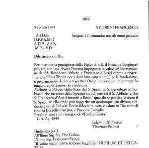 Accludo le Polveri delle Rose del S . Speco di S . Benedetto in Subiaco , che nascono dallo Spineto su cui gettossi il S . Abbate , e che S . Francesco d ’ Assisi innestò a Rose / quando se portò a visitare il S . Speco ; se ella crede può suggerire un qualunque uso divoto , e fiduciale di tali Polveri . Ecciti fiducia in tutti : e saluto in Dio tutti di tutta la Ecc [ ellentissi ] ma , e Piissima Famiglia .