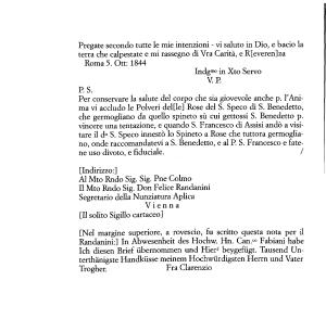Per conservare la salute del corpo che sia giovevole anche p . l ’ Anima vi accludo le Polveri del [ le ] Rose del S . Speco di S . Benedetto , che germogliano da quello spineto sù cui gettossi S . Benedetto p . vincere una tentazione , e quando S . Francesco di Assisi andò a visitare il d « S . Speco innestò lo Spineto a Rose che tuttora germogliano , onde raccomandatevi a S . Benedetto , e al P . S . Francesco e fatene uso divoto , e fiduciale . /
