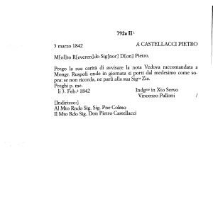 1 La lettera a Castellacci Pietro fu scritta nello spazio libero della lettera n ° 792al in data del 2 Marzo 1842 , sotto l ’ ultima riga . Come risposta non potè essere scritta prima del 2 Marzo . Scrivendo la data , il Pallotti confuse il mese di Marzo con quello di Febbraio . La risposta del Pallotti viene quindi spostata al n °