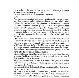 [...’] Alla Comunità4 religiosa dica che p . non isbagliate nel dare , o negare l ’ accettazione della da giovane almeno per nove giorni antecedenti alla decisione , e anche più si faccia dalla intera Comunità l ’ acclusa preghiera / almeno p . tre o più volte al giorno : dopo questo dica alla Comunità che per dare il Voto come vuole Iddio entrino in Capitolo senza propria determinazione pel sì o pel no , e abbiano fiducia che5 saranno mosse a darlo puramente come vuole Iddio conforme le disposizioni , o indisposizioni della Postulante .