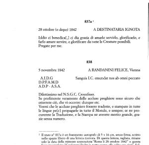 1 II testo n ° 837a è un frammento autografo di 5 x 16 cm , senza firma , scritto nello spazio libero di una lettera ricevuta . Di questa lettera , tagliata , rimane solo la data della mittente sconosciuta :” Roma li 28 ottobre 1842 ” e questa frase incompleta : “ Credetemi Padre la notte scorsa alla solita ora cioè ”. Sullo stesso frammento è notata l ’ autenticità dall ’ Orlandi come segue : “ Autographum S . D . Vincentii Pallotti . In fidem E . S . R . SS . Salvatoris in linda . Die