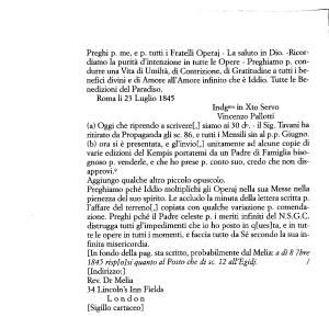Preghiamo pché Iddio moltiplichi gli Operaj nella sua Messe nella pienezza del suo spirito . Le accludo la minuta della lettera scritta p . l ’ affare del terreno !,] copiata con qualche variazione p . comendazione . Preghi pché il Padre celeste p . i meriti infiniti del N . S . G . C . distrugga tutti gl ’ impedimenti che io ho posto in q [ ues ] ta , e in tutte le opere in tutti i momenti , e faccia tutto da Sé secondo la sua infinita misericordia . [ In fondo della pag . sta scritto , probabilmente dal Melia : a dì8 7bre