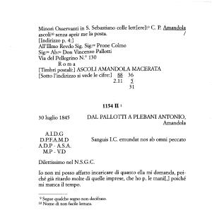1 La lettera del Plebani ( 1154 I ) e la risposta del Pallotti ( 1154 II ) sono scritte su un foglio doppio di cm . 19,6 x 26,6 . La lettera del Plebani si trova sulla la pagina , l ’ indirizzo sulla 4a- La risposta del Pallotti si trova sulla 3a pagina , l ’ indirizzo sulla 2 a . Accanto agli indirizzi si vedono diversi timbri postali . Il Pallotti ha dunque rinviato la lettera del Plebani insieme alla sua risposta .