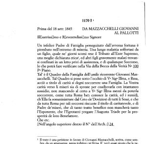 1 H testo è una petizione in favore di Giovanni Mazzacchelli , scritta , come sembra , da un amanuense , senza indirizzo né firma . E ’’ però quasi sicuro che la petizione sia stata mandata al Pallotti che l ’ ebbe nelle sue mani e la inviò a Francesco Fiorini con qualche righa scritta nello spazio Ubero della supplica . Poi , la descrizione del Benefattore fatta nella petizione corrisponde esattamente a Vincenzo Pallotti (“ Padre de ’ miseri - tutta Roma ben conosce la carità , ed i sussidi , ch ’ EIla fa somministrare ”).