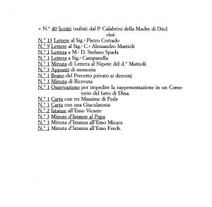 + N .° 40 Scritti ( esibiti dal P . Calabrini della Madre di Dio ] cioè N .° 13 Lettere al Sig . r Pietro Corrado N .° 9 Lettere al Sig . r C . e Alessandro Mattioli N .° 1 Lettera a M . r D . Stefano Spada N .° 1 Lettera a Sig . r Campanella N .° 1 Minuta di Lettera al Nipote del d .° Mattioli N .° 3 Appunti di memoria N .° 1 Brano del Precetto privato ai demonj N .° 1 Minuta di Ricevuta N .° 1 Osservazione per impedire la rappresentazione in un Cemeterio del fatto di Dina . N .° 1 Carta con tre Massime di Fede N .° 1 Carta con una Giaculatoria N .° 2 Istanze all ’ Emo Vicario N .° 3 Minute d ’ istanze al Papa N .° 1 Minuta d ’ istanza all ’ Emo Micara N .° 1 Minuta d ’ istanza all ’ Emo Fesch .