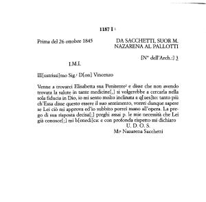 Venne a trovarci Elisabetta sua Penitente12 e disse che non avendo trovata la salute in tante medicine !,] si volgerebbe a cercarla nella sola fiducia in Dio , io mi sento molto inclinata a q [ ues ] to : tanto più eh ' Essa disse questo essere il suo sentimento , vorrei dunque sapere se Lei ciò mi approva ed ’ io subbito porrei mano all ’ opera . La prego di sua risposta decisa !;] preghi assai p . le mie necessità che Lei già conosce !;] mi b ! enedi ] ca : e con profonda rispetto mi dichiaro U . D . O . S . M : a Nazarena Sacchetti