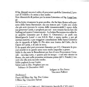 Mi ha ferito vivamente la gran perdita , che ha fatto Roma nella persona della Santa Baronessa6 , ma era matura pel / Cielo ove credo che già avrà ricevuto le corone delle innummerabili (!) opere della sua generosa Carità , e pregherà per noi - non ostante faccia fare dei