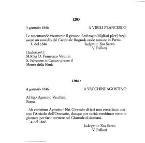 Le raccomando vivamente il giovane Ambrogio Migliati p [ er ] fargli avere un sussidio dal Cardinale Brignole onde tornare in Patria . 3 . del 1846 Indgmo in Xto Servo