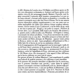 to alla7 distansa da Londra circa 150 Miglia vorrebbero aprire un Ritiro con educazione ecclesiastica p . formarvi nel buon spirito ecclesiastico circa 40 dei personaggi grandi , Ministri , Parrochi , tutti Inglesi convertiti [,] temendo delle pessime conseguen [ ze ,] se non sono bene educati , e formati nello spirito ecclesiastico ; e vorrebbe che venissi io portando meco altri due Preti di Roma . Per le mie miserie doveva rispondere subbito negativamente p . me ; ma come non sarebbe impossibile che Iddio inter infirma volesse scegliere infirmissimum , così ho sentito il mio Confessore8 , e mi ha detto di no , onde p . me non vi penso più - Preghi p . me pché vi cooperi - Penserei di trovare altri , e se è possibile della nostra pia Società ; ella intanto [,] p . quanto può [,] coltivi la idea con Wiseman - il Progetto è ottimo , e necessario da ridursi ad effetto - Circa il suo movimento da costì [,] nel momento non so cosa dire - Potrebbe pensarci se fosse più fruttuoso andare nel Ritiro devisato da Wiseman - oppure venire prima in Roma p . unirsi con altri - basta preghiamo abbandonati in Dio , e