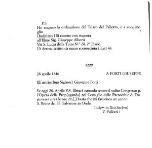 Se oggi 28 . Aprile V . S . Illma è comodo tenere il solito Congresso p . l ’ Opera della Propaganda ] nel Consiglio delle Parrocchie di Trastevere1 circa le ore 216 [,] basta che mi favorisca un cenno . S . Ritiro del SS . Salvatore in Onda
