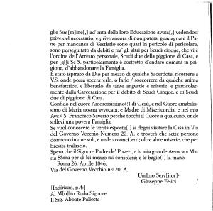 E stato ispirato da Dio per mezzo di qualche Sacerdote , ricorrere a V . S . onde possa soccorrerlo , o farlo / soccorrere da qualche anima benefattrice , e liberarlo da tante angustie e miserie , e particolarmente dalla Carcerazione per il debito di Scudi Cinque , e di Scudi due di piggione di Casa .