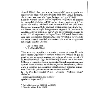 Essendo evidente l ’ utilità delle Cappellanie sud [ dett ] e ; ed insieme incontrastabile il diritto dell ’ O [ rato ] re di poter costringere i Possessori alla vendita dei detti Locali per restituirli all ’ uso del Divino Culto , anzi a scanzo (!) dei giudiziali contestazioni , supplica la Santità Vostra perché voglia benignamente degnarsi di / ordinare la vendita coattiva a tutte spese dell ’ O [ rato ] re per l ’ indicato prezzo di scudi 1200 . da depositarsi nel Sagro Monte di Pietà di Roma7 a favore delle Cappellanie Brandimarte , onde rinvestirli a favore delle medesime , e con i vincoli di sostituzione , che attualmente gravano le botteghe sudette . Che etc .