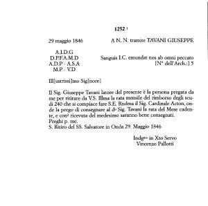 1 H destinatario della lettera è un sconosciuto Ill [ ustrissi ] mo Signore appartenente alla cerchia del Cardinale Acton . La lettera è stata consegnata al Tavani per ritirare la rata mensile concessa dal Cardinale .