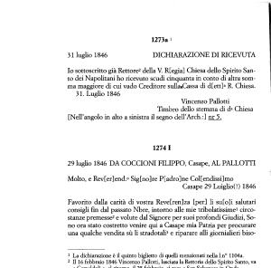 Io sottoscritto già Rettore12 della V . R [ egia ] Chiesa dello Spirito Santo dei Napolitani ho ricevuto scudi cinquanta in conto di altra somma maggiore di cui vado Creditore sulla , Cassa di d [ ett ] a R . Chiesa . 31 . Luglio 1846
