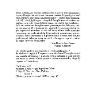gni di famiglia , ma essendo difficilissimo in questo anno rializ [ z ] are in questi luoghi denaro , stante la scarza raccolta dei grani grant .° ed olive , mi trovo oltre modo angustiatissimof ,] stretto della necessità , poichè [,] dissi !,] gli urgenti bisogni di famiglia non mi lasciano dilazione , e mi vedo chiuse tutte le strade ; giacche le mie preghiere e della mia numerosa famiglia niente possano perchè diffettose , prego per amor di Di e di Maria SS . a vostra Rive [ ren ] za perchè si voglia degnare di ricordarsi di noi nel Santo Altare , onde possiamo camminare per quelle vie della divina volontà sostenendoci sempre in questa foriosa tempesta , e di persecuzione ; e pieno però di tutta quella stimai ,] dovuta a suoi meriti [,] col maggior rispetto e stima mi segno di vostra River [ en ] za