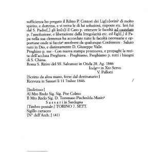 sufficienza ho pregato il Rdmo P . Centori dei Lig [ u ] orini3 di molto spirito , e dottrina , e vi trova le di lui soluzioni , risposte etc . Ieri fui dal S . Padre [,] gli les [ s ] i il Caso p . ottenere le facoltà ad cautelam p . l ’ assoluzione , e liberazione dalla Irregolarità etc . ed Egli [,] il Papa nella sua clemenza ha accordato tutte le facoltà necessarie e opportune onde si faccia4 assolvere da qualunque Confessore - Saluto tutti in Dio , e distintamente D . Giuseppe Valle .