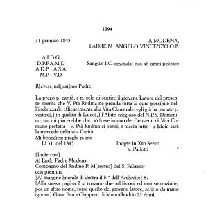 La prego p . carità , e p . zelo di sentire il giovane Latore del presente : merita che V . Ptà Rndma ne prenda tutta la cura possibile nell ’ indirizzario efficacemente alla Vita Claustrale : egli già ha parlato p . vestiref ,] in qualità di Laico [,] l ’ Abito religioso del N . P . S . Domenico ; ma mi piacerebbe che ciò fosse in uno dei Conventi di Vita Comune perfetta - V . Ptà Rndma ci pensi , e faccia tutto - e Iddio sarà la mercede della sua Carità .