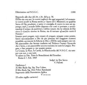 Servo di Dio prudente , e santo vi consiglia di venire io non mi oppongo ; ma12 !,] avendo Iddio disposto che costì vi portaste , e avvicinandosi il tempo da partirne !,] debbo tenere che la volontà di Dio circa il v [ ost ] ro ritorno in Roma , sia di tornare q [ uan ] do verrà il