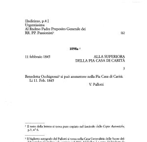 1 II biglietto autografo del Pallotti si trova nella Casa Generalizia delle Suore dell ’ Apostolato Cattolico e fu copiato nel 1946 dal Faller . La carta del biglietto fu ricavata da una lettera indirizzata al Pallotti . Non si tratta di una lettera , ma del permesso di ammettere una ragazza nella Pia Casa . Ciò permette di considerarne la Superiora come destinataria del biglietto . La cifra 3 nell ’ angolo superiore destro è di mano ignota .