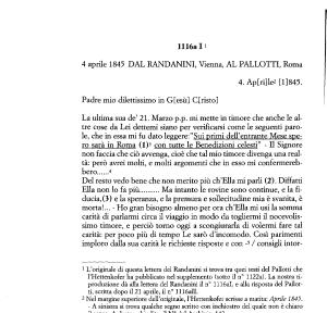 1 L ’ originale di questa lettera del Randanini si trova tra quei testi del Pallotti che l ’ Hettenkofer ha pubblicato nel supplemento ( sotto il n ° 1122a ). La nostra riproduzione dà alla lettera del Randanini il n ° lllóal , e alla risposta del Pallotti , scritta dopo il 21 aprile , il n ° 1 libali .