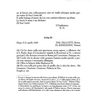 1 H testo è dunque la risposta alla lettera precedente . Il Pallotti la scrisse nello spazio libero del foglio ricevuto , ripetendo le cifre 1,2 e 3 nella pagina prima , la cifra 4 nella pagina seconda , dopo le parole finali : Di Sua Carità . - Mentre il Randanini firmò con l ’ abbreviazione N . N ., il Pallotti non firmò affatto la risposta .