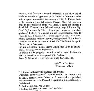 cessarla , e si facciano i restauri necessari !, e tutt ’ altro che si crede necessario , e opportuno per la Chiesa , e Convento ; e che tutte le spese occorrenti si facciano col reddito dei Canoni , frutto dei Censi , e frutti del piccolo Terreno , Orto , Oliveta etc ., onde in tale posizione prego V . S . Dima di agire per tutelare i diritti della Comune come Priore di essa , e prego il Rndmo Sig .